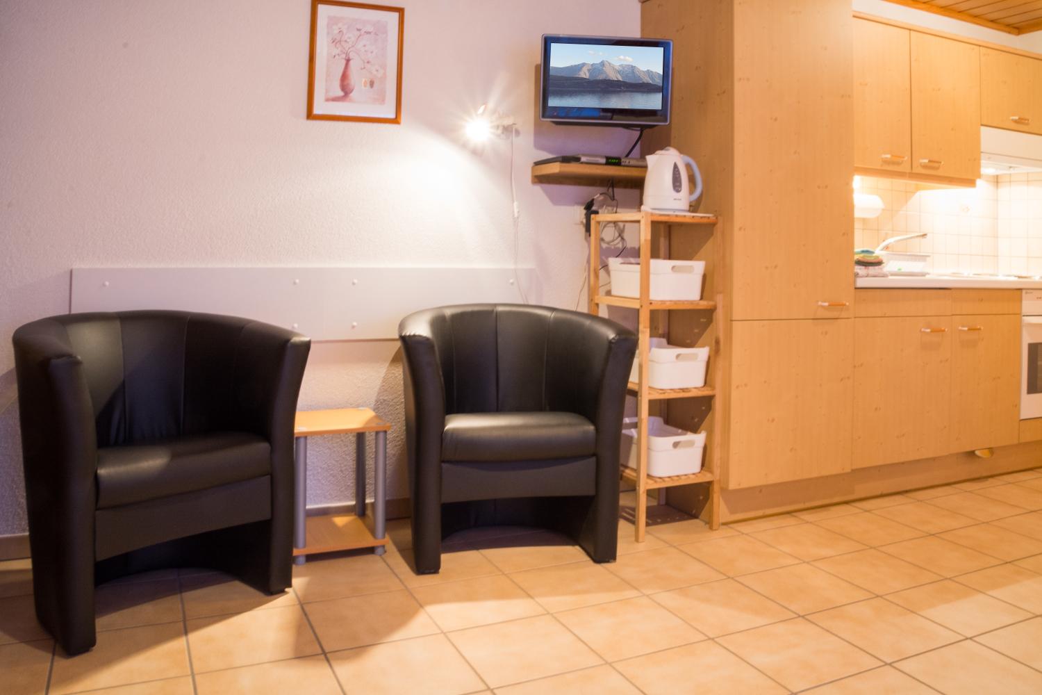In der Wohnung steht ein Flachbildfernseher mit Satellit bereit.