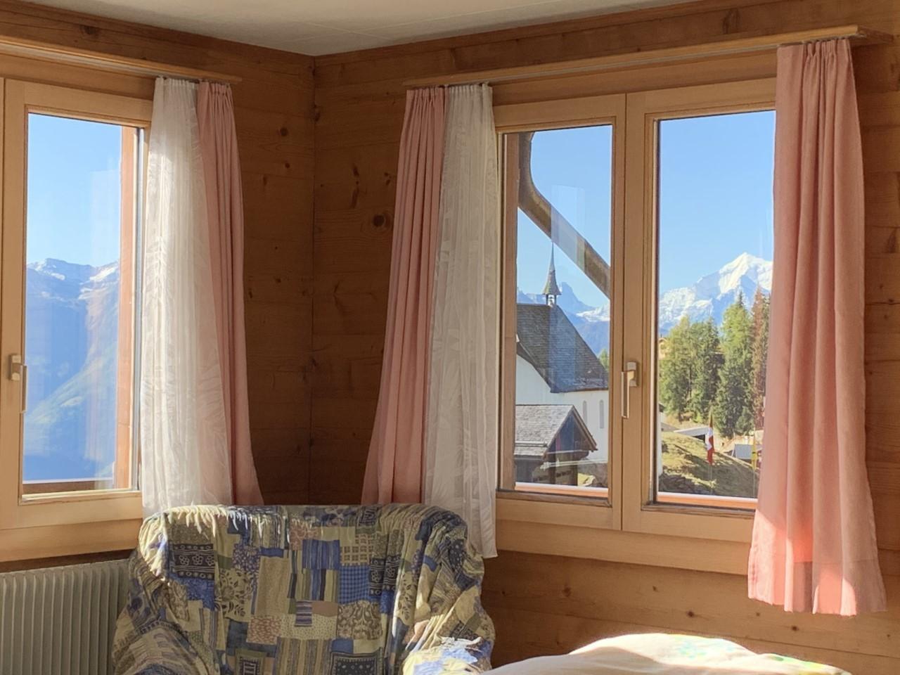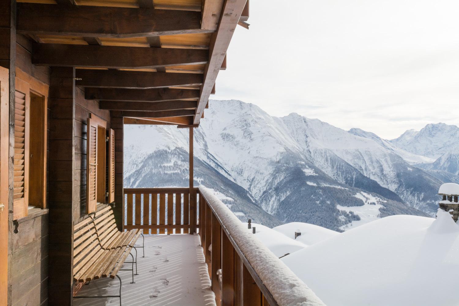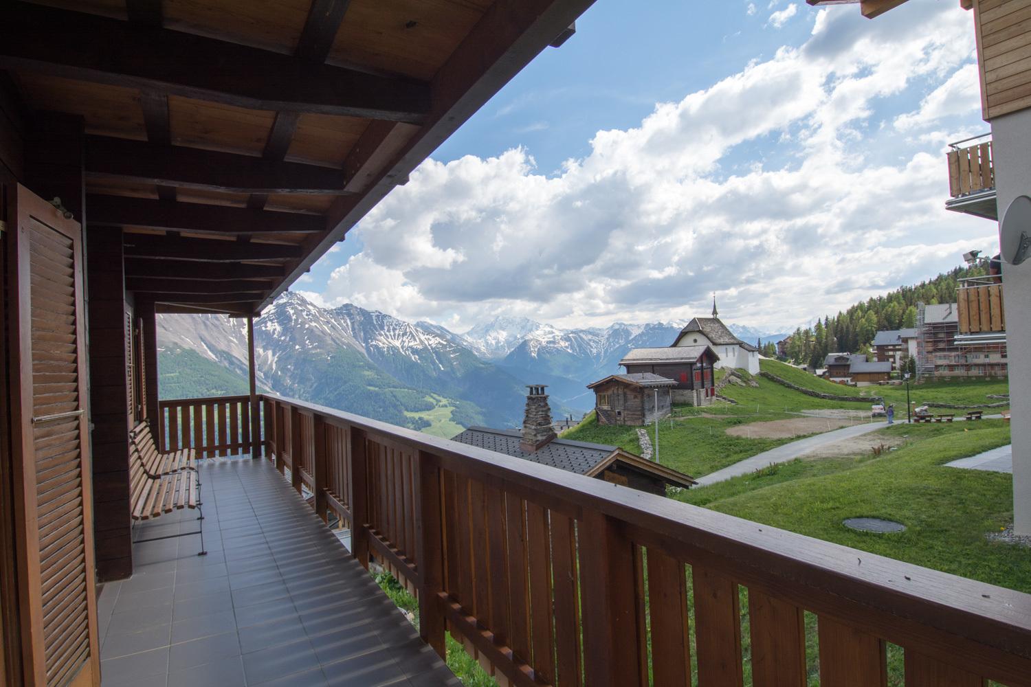 Einen grossen Balkon mit Stühlen und einem Tisch steht zur Wohnung dazu, um die Aussicht auf die Walliser Berge zu geniessen.