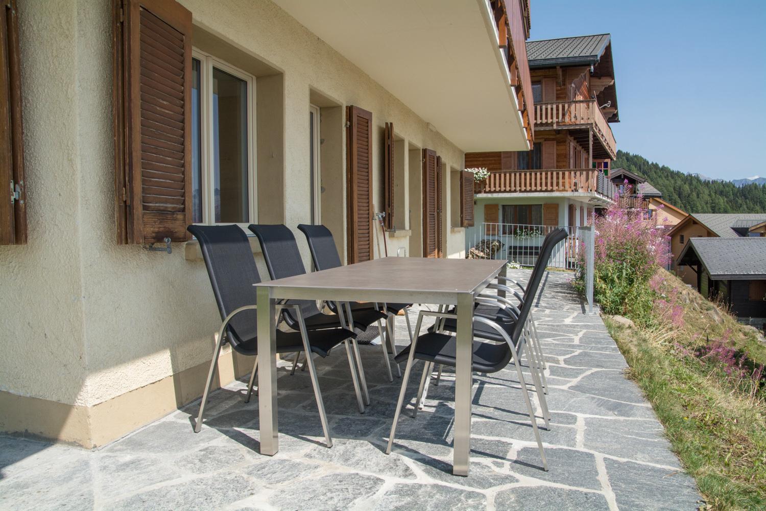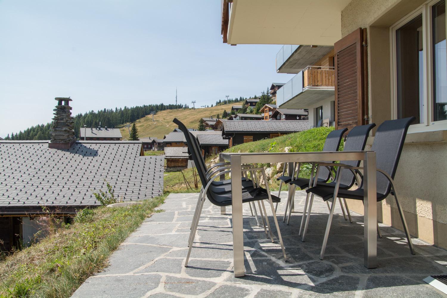 Auf dem neuen Vorplatz (mit Süd-West-Ausblick) mit Tisch und Stühlen für gemütliches Beisammensein, können Sie die Sonne geniessen. Erhalten bleibt natürlich der wunderschöne, unverbaute Ausblick auf die Kapelle "Maria zum Schnee" und die prächtigen Walliser Alpen.