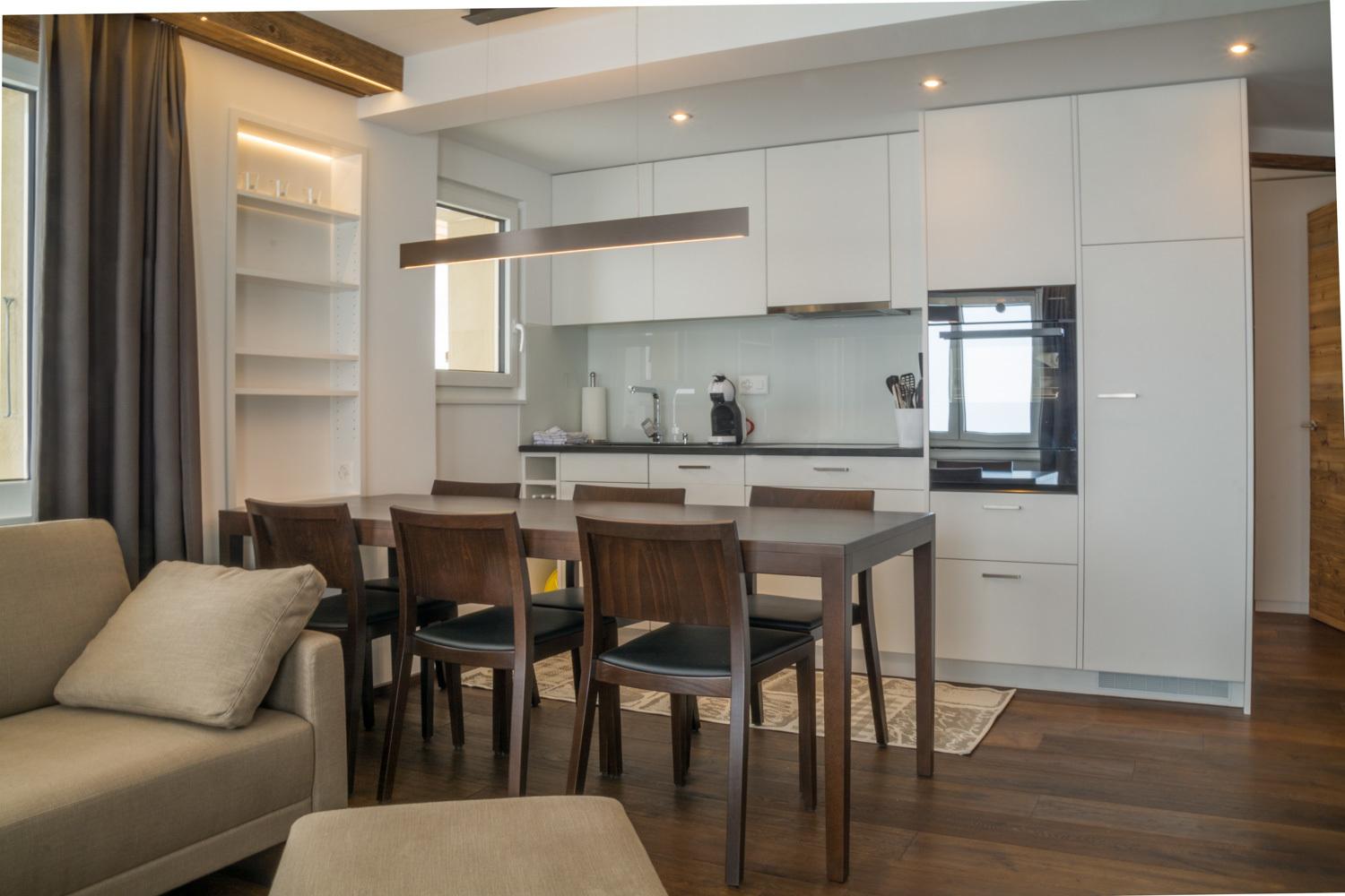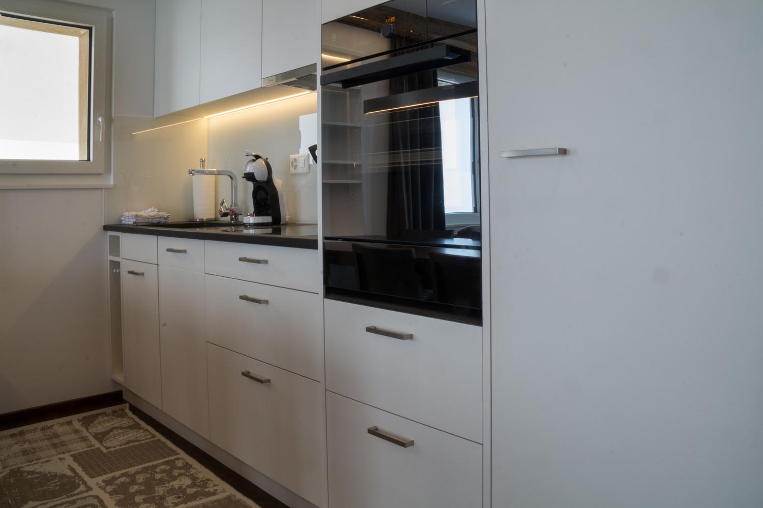Die Küche ist ausgestattet mit einer Geschirrspühlmaschine, Backofen mit Steamer und einer Kapselkaffeemaschine (Dolce Gusto). Auch einem Fondueplausch oder Raclette Abend wird nichts im Wege stehen. Für die Wohnung hat es ausserdem eine Waschmaschine und Trockner zur alleinigen Benutzung. Ebenfalls ist die Wohnung mit einem SAT-Fernseher im Wohnzimmer und in einem Schlafzimmer,mit kostenlosem WiFi, einem Radio und CD-Player ausgestattet.