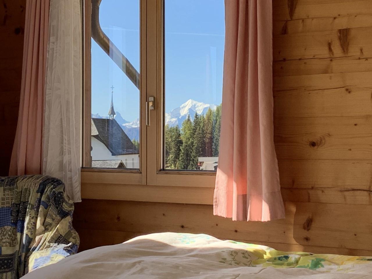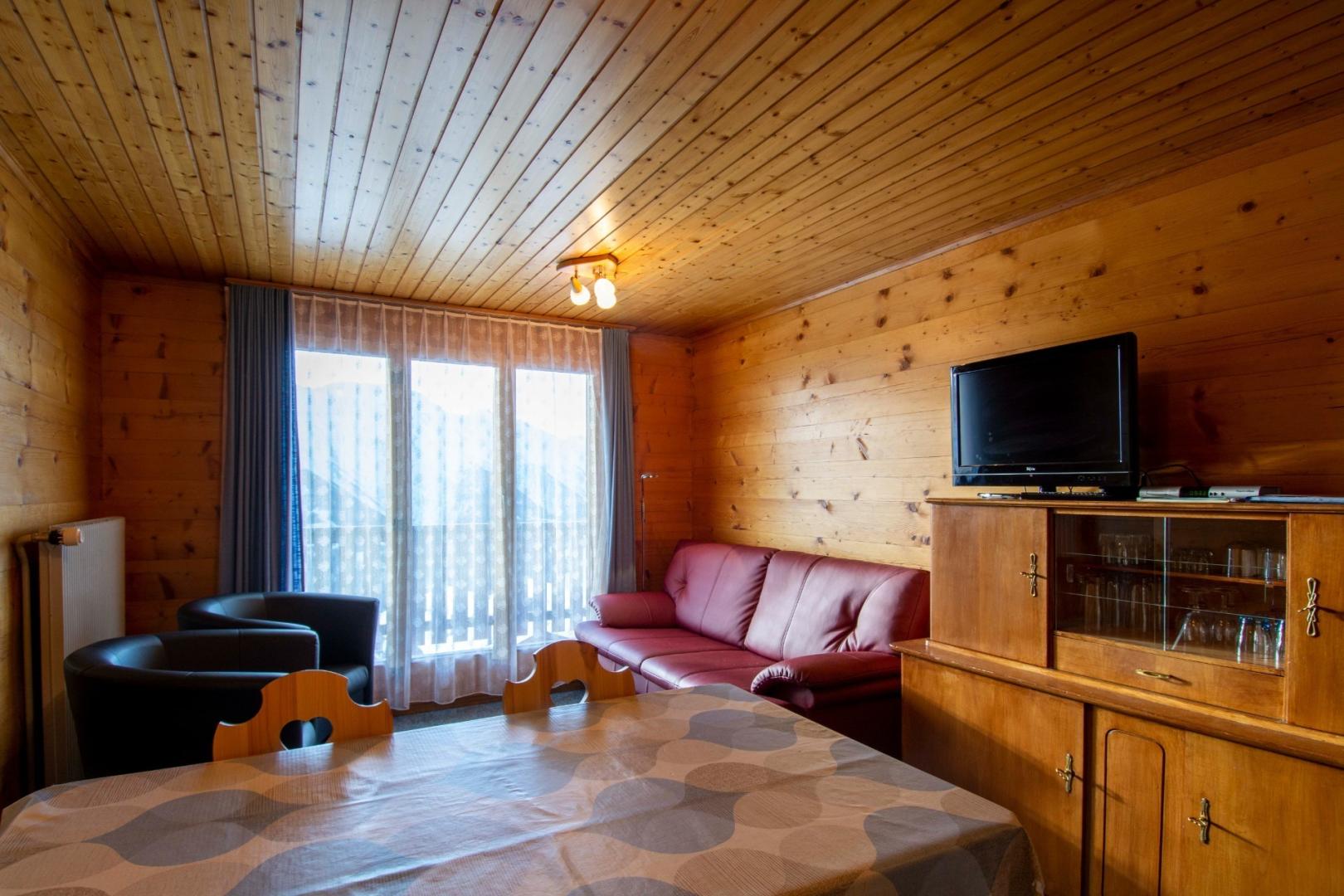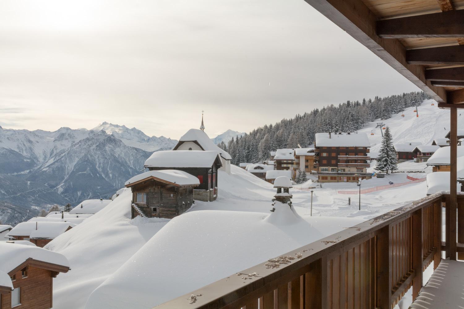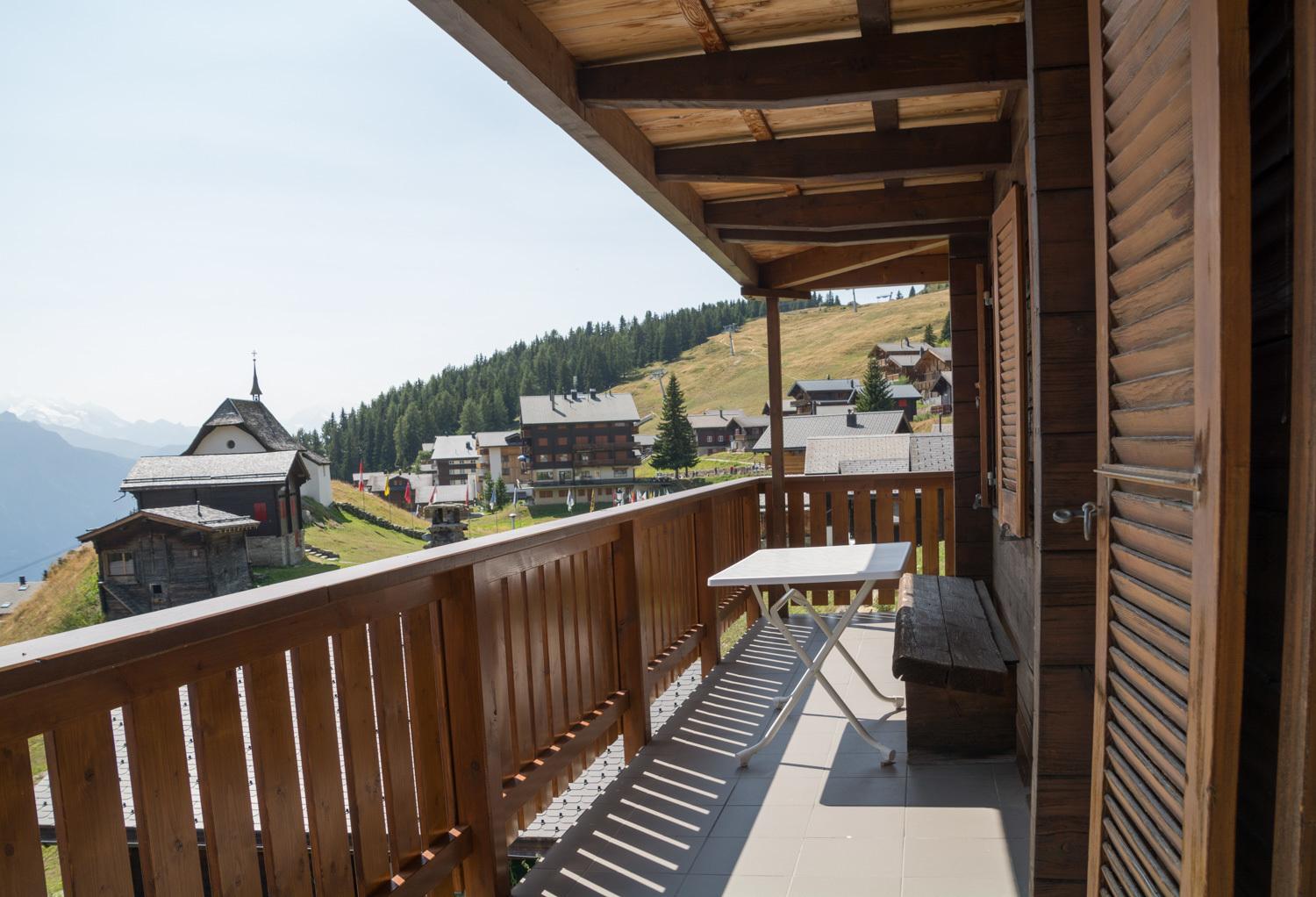 Einen grossen Balkon mit Stühlen und einem Tisch steht zur Wohnung dazu, um die Aussicht auf die Walliser Berge zu geniessen.